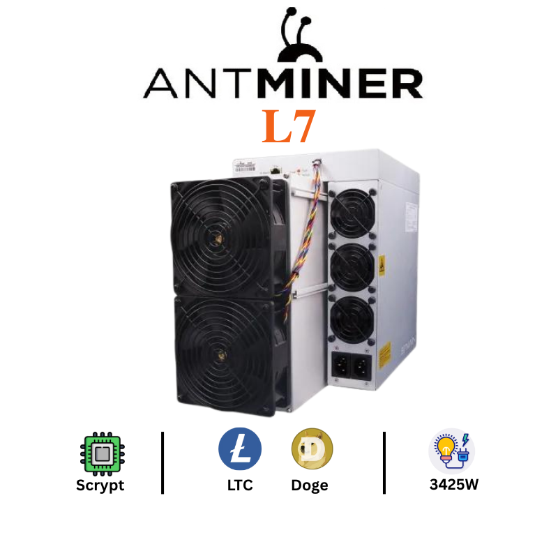 Bitmain Antminer L7 (9.5Gh) is an ASIC miner designed for Scrypt algorithm, specifically targeting DOGE (Dogecoin) and LTC (Litecoin). It delivers a maximum hashrate of 9.5Gh/s while consuming 3425W of power, resulting in an energy efficiency of 0.361j/Mh.